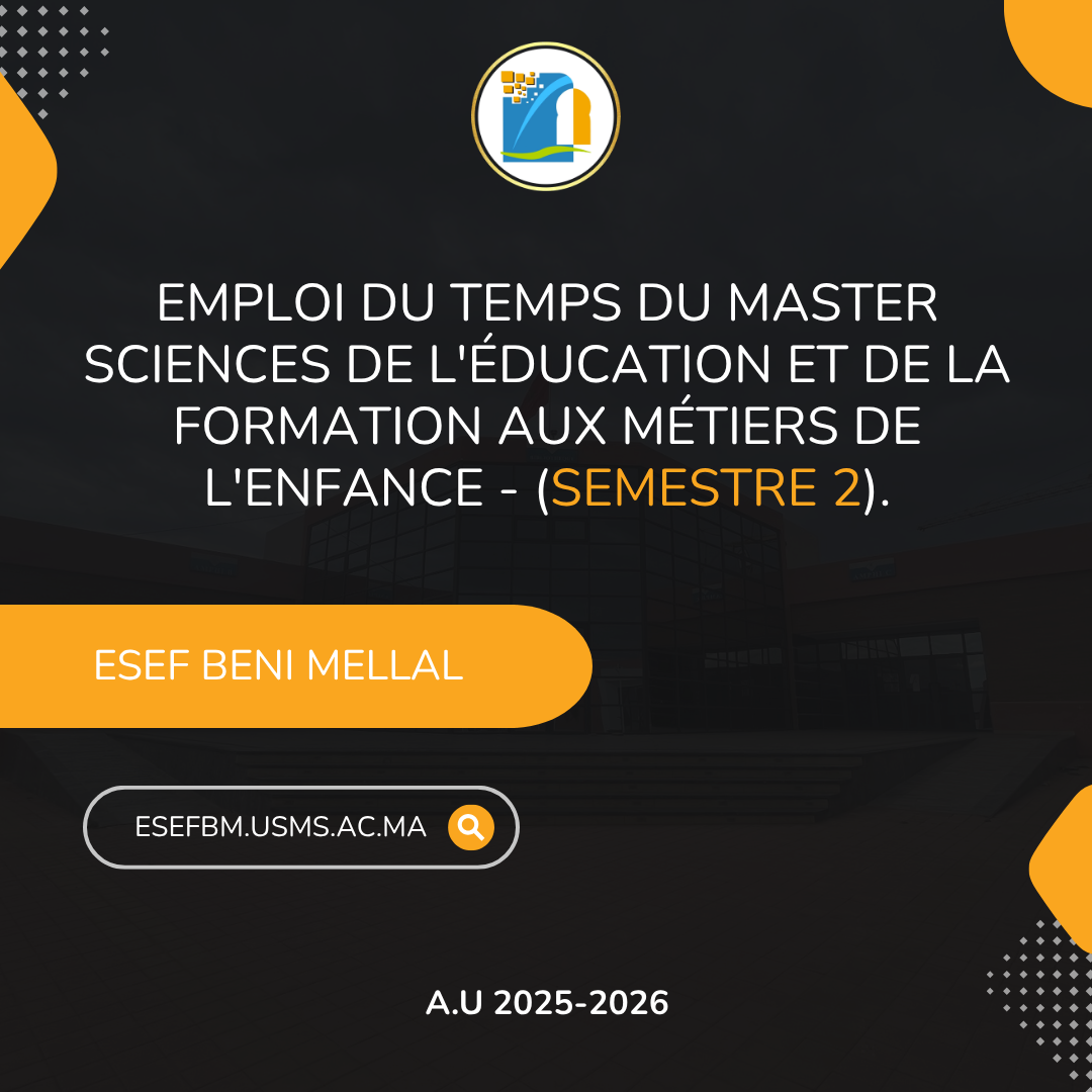 Les étudiants inscrits en licence d'éducation de S2, S4, S6 et première année de master sont invités à participer à la caravane ELOGHA-SUP, qui se tiendra à l'ESEF de Beni Mellal le jeudi 16 avril 202...